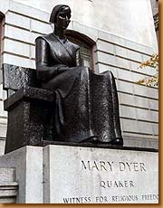 Quaker Mary Dyer, whose bronze statue stands on the Boston Commons, was a gentlewoman by birth and a rebel by trade. Quakers were considered dangerous subversives in 17th century England, where they were flogged and deported or hanged. Mary Dyer came to Massachusetts and was banished from Boston with a warning that she would be hanged if she returned. Within a month she did return, was banished again and, and after returning again, she was hanged in 1660.